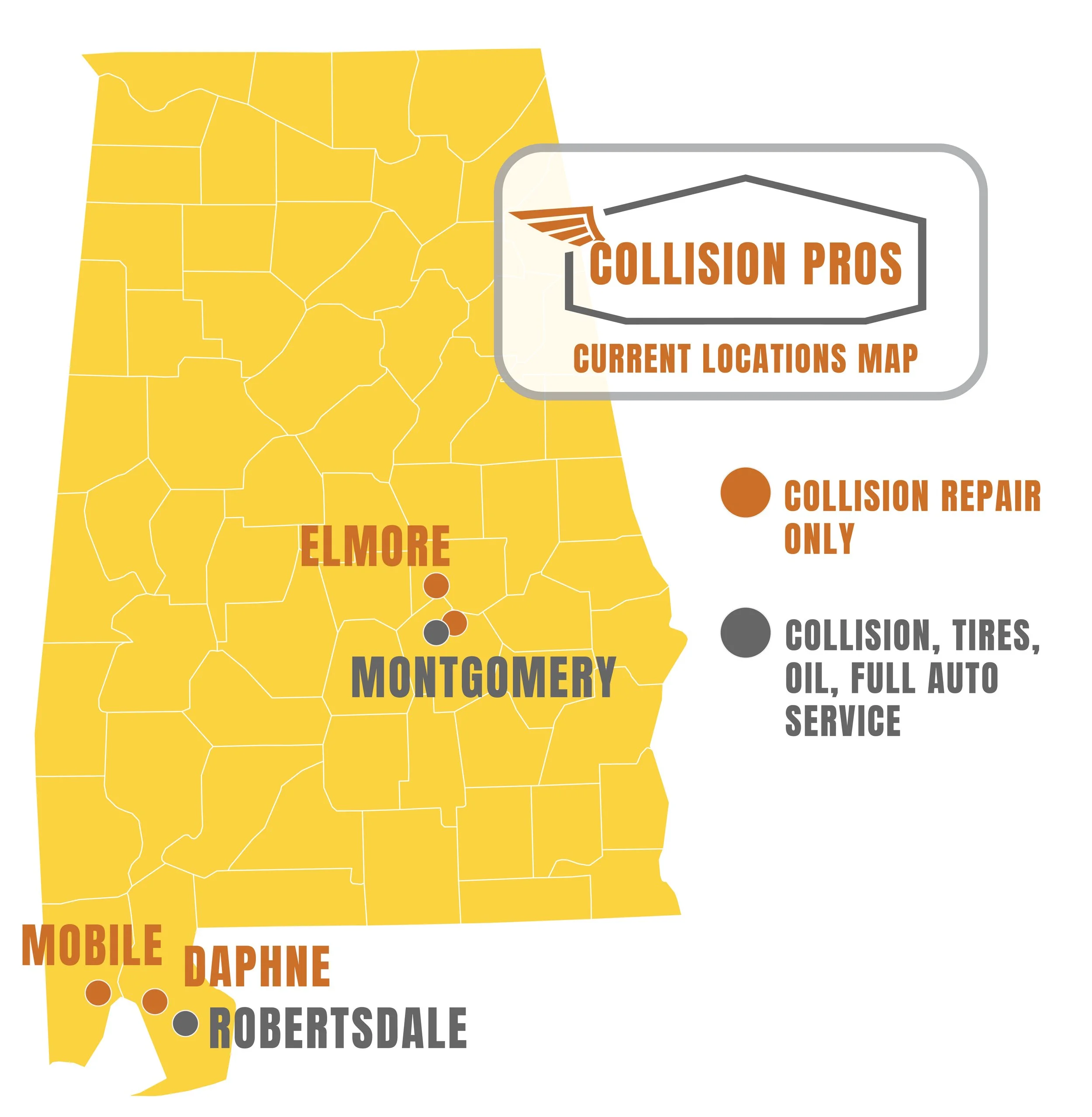COLLISION PROS is a group of locally recognized brands across Alabama, offering speed, reliability, and personalized service in collision repair with each location averaging over 4/5 stars in reviews.